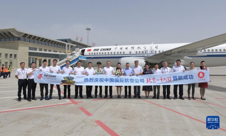 7月25日,参加北京至和田首航的国航工作人员在和田昆冈机场合影。新华社记者 李贺 摄
