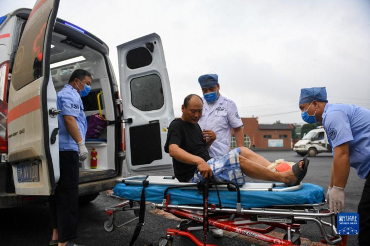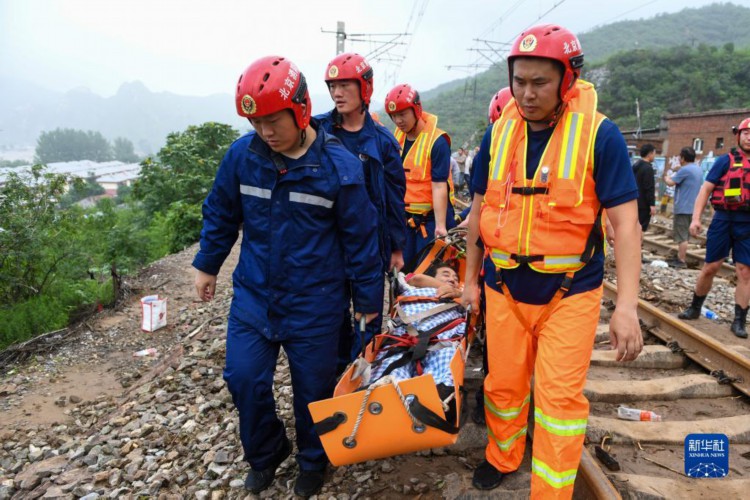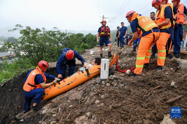 8月1日,在北京市门头沟区水峪嘴村,在此增援的北京大兴区消防救援支队的消防员在转运一名受伤村民。 受台风“杜苏芮”影响,北京自7月29日开始连续强降雨,西部、西南部、南部遭遇特大暴雨。位于北京市西部的门头沟区部分区域发生山洪灾害,记者在一线直击救援现场。 新华社记者 鞠焕宗 摄