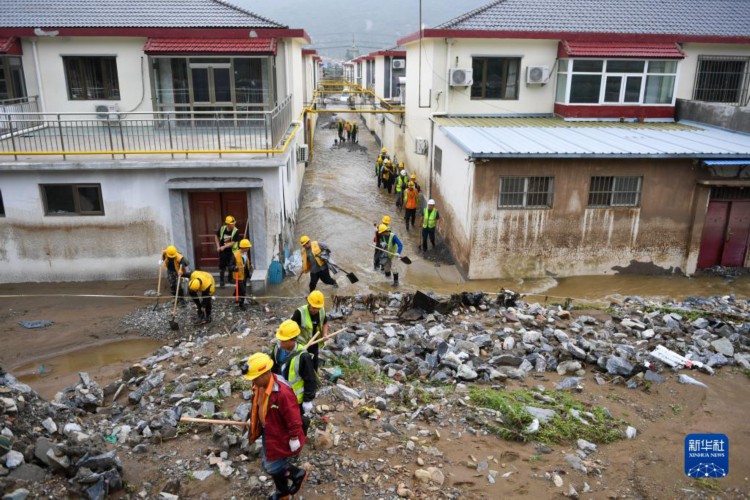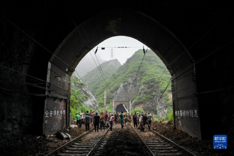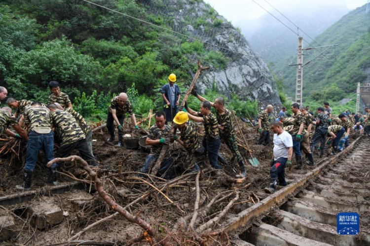 8月1日,在北京市门头沟区水峪嘴村附近一段被阻断的铁路线上,中铁六局工作人员在清理轨道上的杂物,全力恢复交通。 受台风“杜苏芮”影响,北京自7月29日开始连续强降雨,西部、西南部、南部遭遇特大暴雨。位于北京市西部的门头沟区部分区域发生山洪灾害,记者在一线直击救援现场。 新华社记者 鞠焕宗 摄