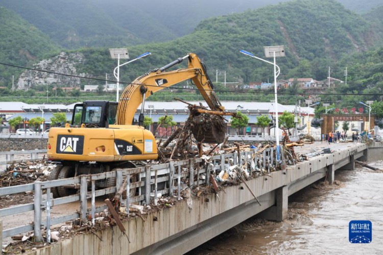 8月1日,在北京市门头沟区水峪嘴村村口,一台挖掘机在清理阻断桥梁交通的杂物。目前该条道路已经疏通完成。 受台风“杜苏芮”影响,北京自7月29日开始连续强降雨,西部、西南部、南部遭遇特大暴雨。位于北京市西部的门头沟区部分区域发生山洪灾害,记者在一线直击救援现场。 新华社记者 鞠焕宗 摄