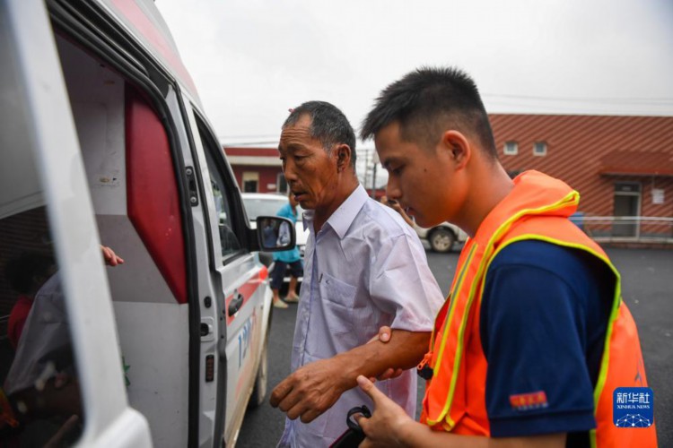 8月1日,在北京市门头沟区妙峰山镇妙峰山民族学校临时安置点,门头沟区消防救援支队的消防员搀扶一名伤者登上救护车。 受台风“杜苏芮”影响,北京自7月29日开始连续强降雨,西部、西南部、南部遭遇特大暴雨。位于北京市西部的门头沟区部分区域发生山洪灾害,记者在一线直击救援现场。 新华社记者 鞠焕宗 摄