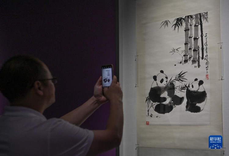 8月2日,参观者在北京民生现代美术馆欣赏吴作人作品《熊猫》。