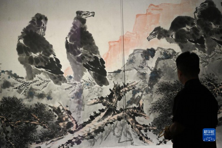 8月2日,参观者在北京民生现代美术馆欣赏李苦禅作品《山岳钟英》。 目前,“文明的传承:以启山林——百年巨匠艺术大展”正在北京民生现代美术馆举行,展出齐白石、张大千、潘天寿、李苦禅等40余位艺术家近200组件作品,吸引人们前来观展欣赏。 新华社记者 尹栋逊 摄