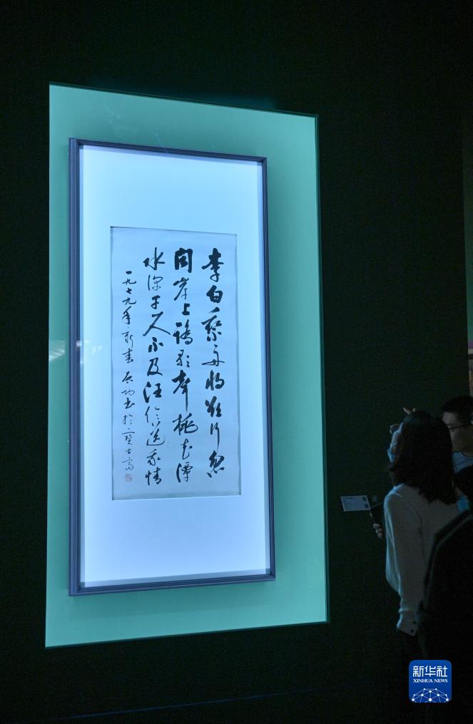 8月2日,参观者在北京民生现代美术馆欣赏启功书法作品。 目前,“文明的传承:以启山林——百年巨匠艺术大展”正在北京民生现代美术馆举行,展出齐白石、张大千、潘天寿、李苦禅等40余位艺术家近200组件作品,吸引人们前来观展欣赏。 新华社记者 尹栋逊 摄