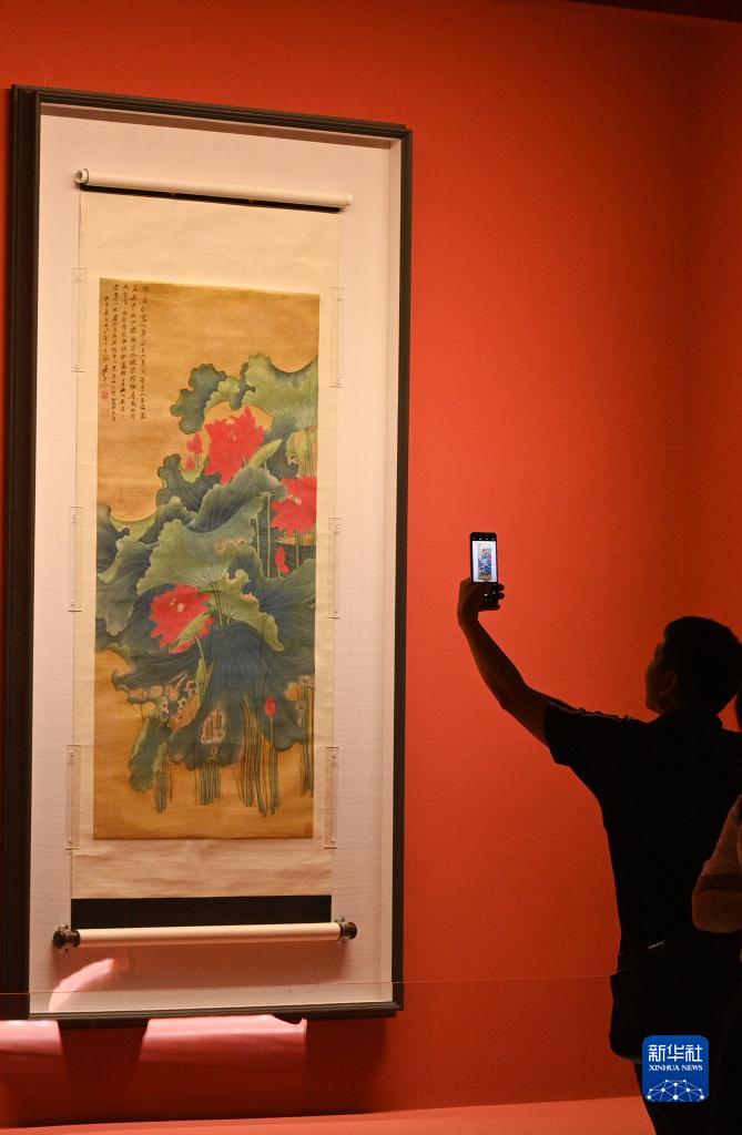 8月2日,参观者在北京民生现代美术馆欣赏张大千作品《荷花》。 目前,“文明的传承:以启山林——百年巨匠艺术大展”正在北京民生现代美术馆举行,展出齐白石、张大千、潘天寿、李苦禅等40余位艺术家近200组件作品,吸引人们前来观展欣赏。 新华社记者 尹栋逊 摄