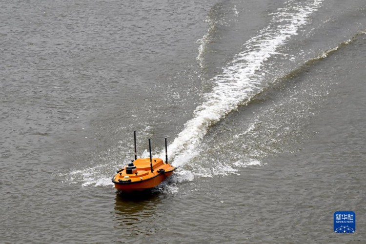 8月2日,一艘无人水文监测船在天津独流减河进洪闸上游航行监测。 当日,记者来到天津市独流减河进洪闸水利枢纽了解到,截至8月2日16时,枢纽站上游监测水位5.93米,来水上涨1.2米。目前枢纽站的闸门全部开启敞泄上游来水,为天津市区及雄安新区防汛工作疏解压力。 独流减河进洪闸位于海河流域大清河、子牙河与独流减河交汇处。目前,独流减河进洪闸水文站工作人员根据上游实际来水量,安排人员每日两次进行水文统计与监测,根据实际水位情况实时调控闸门开启程度,保障上游来水平稳进入独流减河。 新华社记者 孙凡越 摄