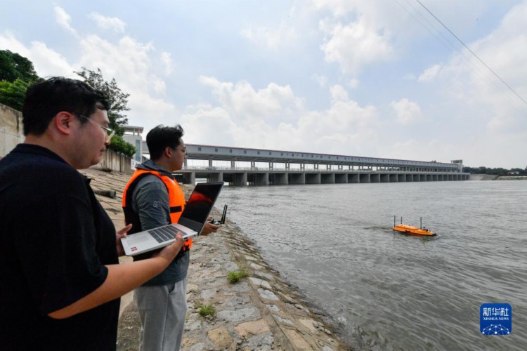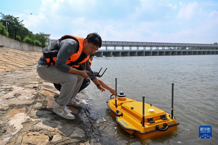 8月2日,在天津市独流减河进洪闸上游,水文人员操作无人水文监测船进行水文监测。 当日,记者来到天津市独流减河进洪闸水利枢纽了解到,截至8月2日16时,枢纽站上游监测水位5.93米,来水上涨1.2米。目前枢纽站的闸门全部开启敞泄上游来水,为天津市区及雄安新区防汛工作疏解压力。 独流减河进洪闸位于海河流域大清河、子牙河与独流减河交汇处。目前,独流减河进洪闸水文站工作人员根据上游实际来水量,安排人员每日两次进行水文统计与监测,根据实际水位情况实时调控闸门开启程度,保障上游来水平稳进入独流减河。 新华社记者 孙凡越 摄