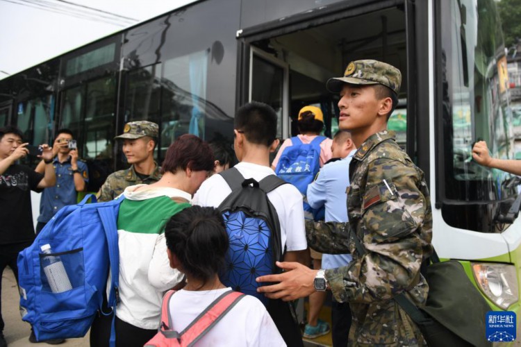 8月2日,在北京市门头沟区妙峰山镇政府附近,武警北京总队机动三支队官兵引导旅客排队乘坐大巴车转移。 当日,因强降雨被困北京门头沟山区的列车旅客陆续安全转移。 新华社记者 鞠焕宗 摄