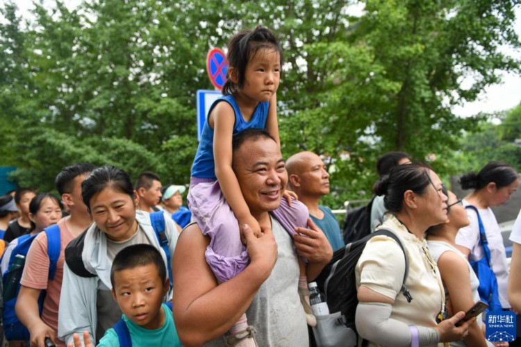 8月2日,在北京市门头沟区妙峰山镇政府附近,旅客排队准备乘坐大巴车。 当日,因强降雨被困北京门头沟山区的列车旅客陆续安全转移。 新华社记者 鞠焕宗 摄