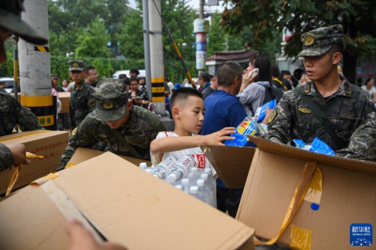 8月2日,在北京市门头沟区妙峰山镇政府附近,武警北京总队机动三支队官兵为K396次列车旅客分发食物和水。
