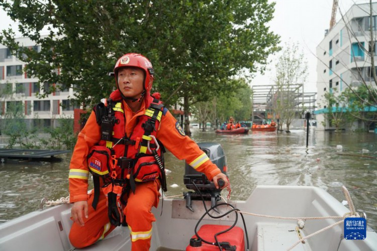8月2日,在北京市房山区琉璃河镇平各庄村,消防员驾驶冲锋舟前往救援受灾群众。