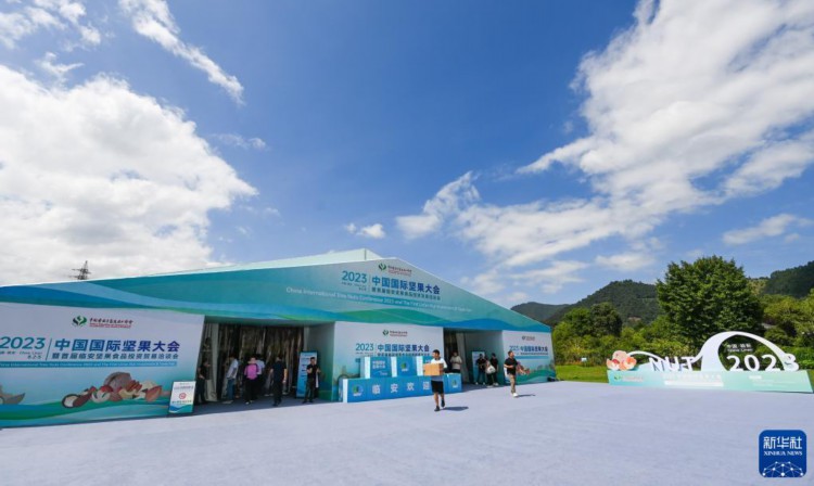 这是8月3日拍摄的2023中国国际坚果大会的展销会现场。 8月2日至8月5日,2023中国国际坚果大会暨首届临安坚果食品投资贸易洽谈会在浙江省杭州市临安区召开,来自20多个国家和地区的境外企业及国内外坚果食品行业的龙头企业、贸易商、专业协会等参加活动,本次大会包括展销会、贸易洽谈会、参观龙岗镇相关坚果企业等内容。 坐落在山核桃主产区的杭州市临安区龙岗镇作为中国“坚果重镇”,近年来,通过数字化改革、出台人才优惠政策、开展“千名干部助千企”活动等方式,从“小坚果、初加工、单一产业”向“大食品、精制造、多元业态”转型升级,致力打造百亿级食品产业集群。 新华社记者 徐昱 摄