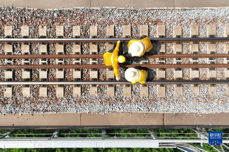8月3日,中国铁路上海局集团有限公司徐州电务段工作人员进行轨道电路检测(无人机照片)。