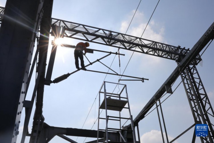8月3日,中国铁路上海局集团有限公司徐州供电段工作人员进行接触网检修作业。