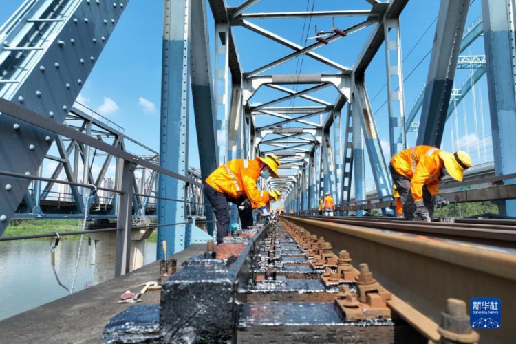 当日,中国铁路上海局集团有限公司开展“工电供”多工种联合作业,对陇海铁路上行线邳州运河铁路桥进行检修养护,为暑运安全提供保障。