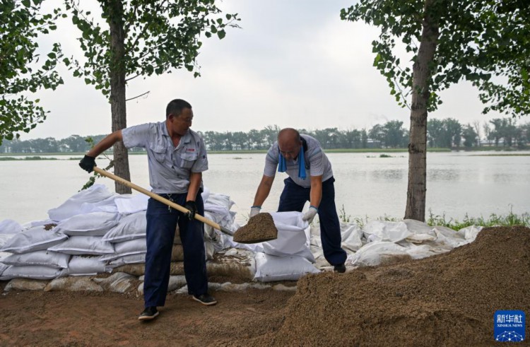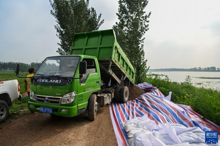 8月3日,在天津市静海区台头镇,中建八局工人在大清河北堤上进行堤坝加高加固。 当日,来自中建、中交等多个单位的工人和静海区当地村民共千余人忙碌在大清河天津市静海段南北两岸,持续进行两岸堤坝加高加固工作,以应对大清河河道内不断增长的上游来水。 新华社记者 孙凡越 摄