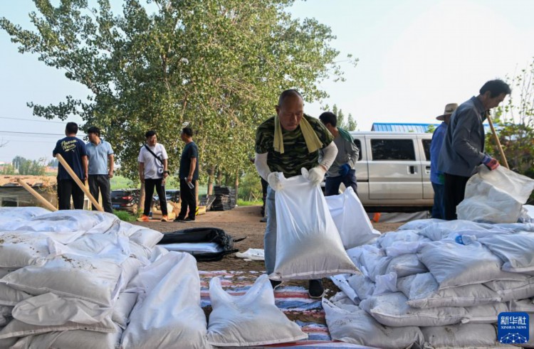 8月3日,在天津市静海区台头镇,工人在大清河北堤上参与堤坝加高加固工作。 当日,来自中建、中交等多个单位的工人和静海区当地村民共千余人忙碌在大清河天津市静海段南北两岸,持续进行两岸堤坝加高加固工作,以应对大清河河道内不断增长的上游来水。 新华社记者 孙凡越 摄