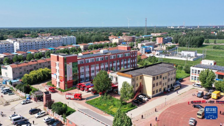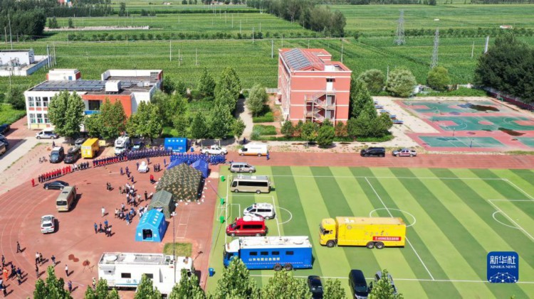8月6日,在平原县王打卦中心小学,应急救援队伍集结待命(无人机照片)。 8月6日凌晨2时33分,山东德州市平原县发生5.5级地震后,记者迅速从济南赶往震中平原县王打卦镇附近。截至6日10时,平原县20人轻微受伤,126处房屋倒塌,水、电、通讯正常,加油站等设施正常。记者在现场看到,山东当地多种救援力量有序开展工作,社会秩序基本平稳。 新华社记者 郭绪雷 摄