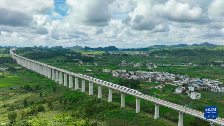 试验动车组经过位于贵州省独山县的贵南高铁拉里双线特大桥(8月2日摄)。