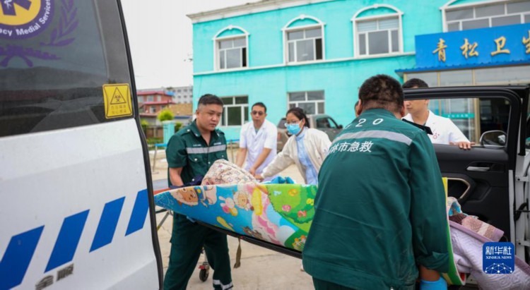8月6日,舒兰市青松卫生院医护人员将受困群众运送至医院。