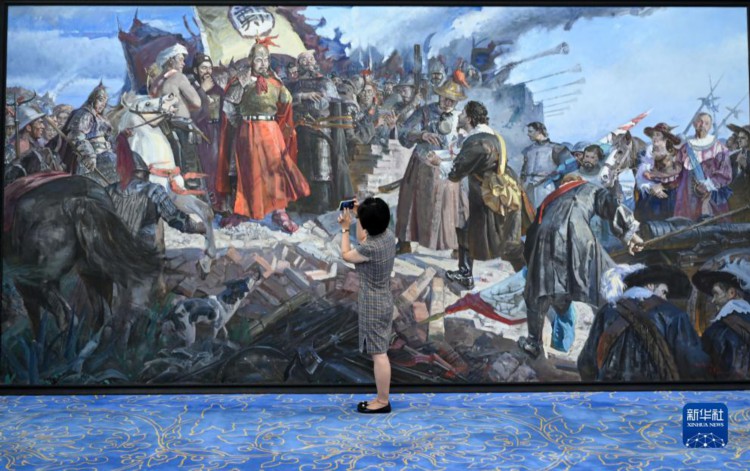 8月7日,媒体工作人员在捐赠仪式上拍摄罗田喜油画《郑成功—1662》。