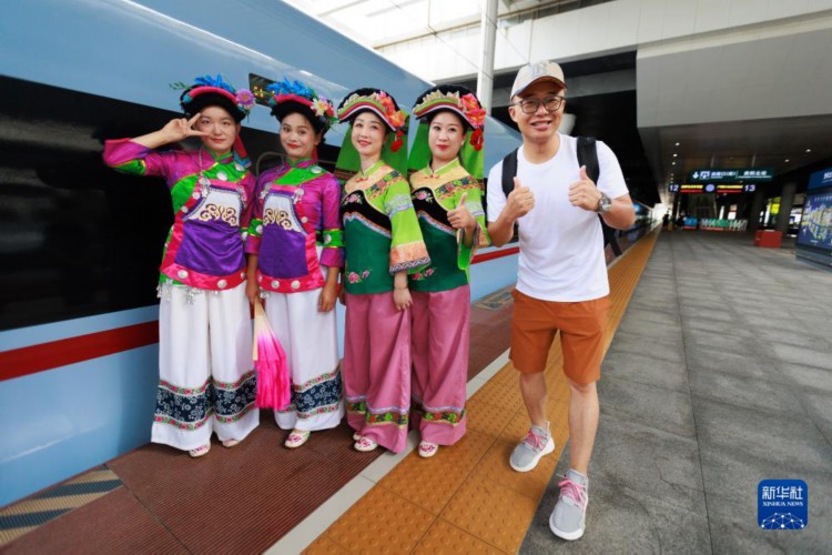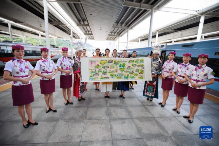 8月8日,旅客在荔波站内和身着民族特色服装的工作人员合影。 当日,随着贵阳北至荔波的D6171次列车驶出贵阳北站,贵阳至南宁高速铁路贵阳至荔波段正式开通运营。据了解,贵南高铁是我国“八纵八横”铁路网包头到海南铁路通道的重要组成部分,线路全长482公里,设计时速350公里,贵阳至荔波最快57分钟可达。 新华社记者 刘续 摄