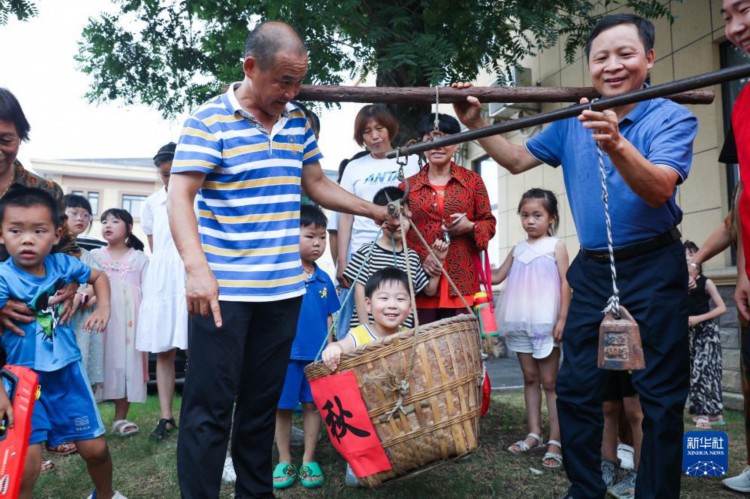 8月8日,村民在姚家村文化礼堂前用传统方式给孩子们称体重。 当日,浙江省湖州市长兴县画溪街道在姚家村文化礼堂开展“多彩民俗迎立秋”主题活动,通过“瓜上雕刻”、“啃秋”吃西瓜、悬秤称重等趣味活动,让孩子们体验传统民俗,了解节气的相关知识。 新华社记者 徐昱 摄 |