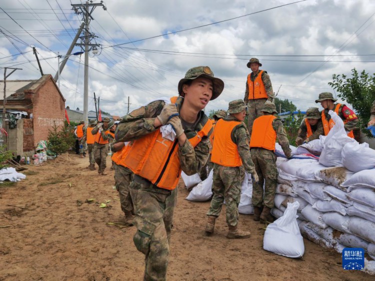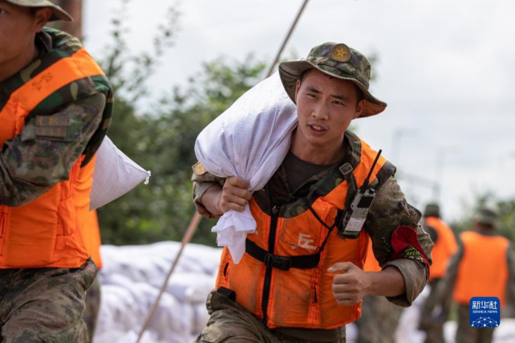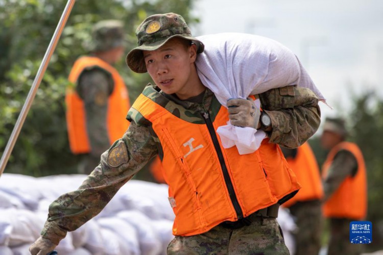 8月8日,在哈尔滨市双城区万隆乡增产村抗洪现场,陆军第78集团军某旅官兵在运送筑坝沙袋。 装满沙袋,扛上肩头,疾速前进……一名名年轻官兵身穿迷彩服和救生衣,将一个个白色沙袋筑成一道长约两公里的“白色长城”。8日正午时分,在黑龙江省哈尔滨市双城区万隆乡增产村,来自陆军第78集团军某旅的800余名官兵奋战在抗洪一线。 新华社记者 张涛 摄