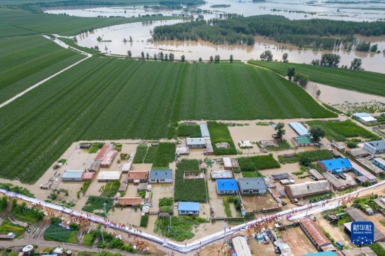 陆军第78集团军某旅官兵在构筑堤坝(8月8日摄,无人机照片)。 装满沙袋,扛上肩头,疾速前进……一名名年轻官兵身穿迷彩服和救生衣,将一个个白色沙袋筑成一道长约两公里的“白色长城”。8日正午时分,在黑龙江省哈尔滨市双城区万隆乡增产村,来自陆军第78集团军某旅的800余名官兵奋战在抗洪一线。 新华社记者 张涛 摄