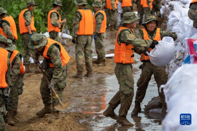 8月8日,在哈尔滨市双城区万隆乡增产村抗洪现场,陆军第78集团军某旅官兵在筑坝。 装满沙袋,扛上肩头,疾速前进……一名名年轻官兵身穿迷彩服和救生衣,将一个个白色沙袋筑成一道长约两公里的“白色长城”。8日正午时分,在黑龙江省哈尔滨市双城区万隆乡增产村,来自陆军第78集团军某旅的800余名官兵奋战在抗洪一线。 新华社记者 杨思琪 摄