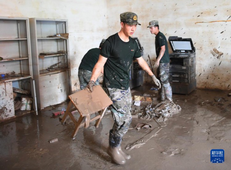 8月10日,武警河北总队保定支队战士在涿州中学教学楼清理物品。