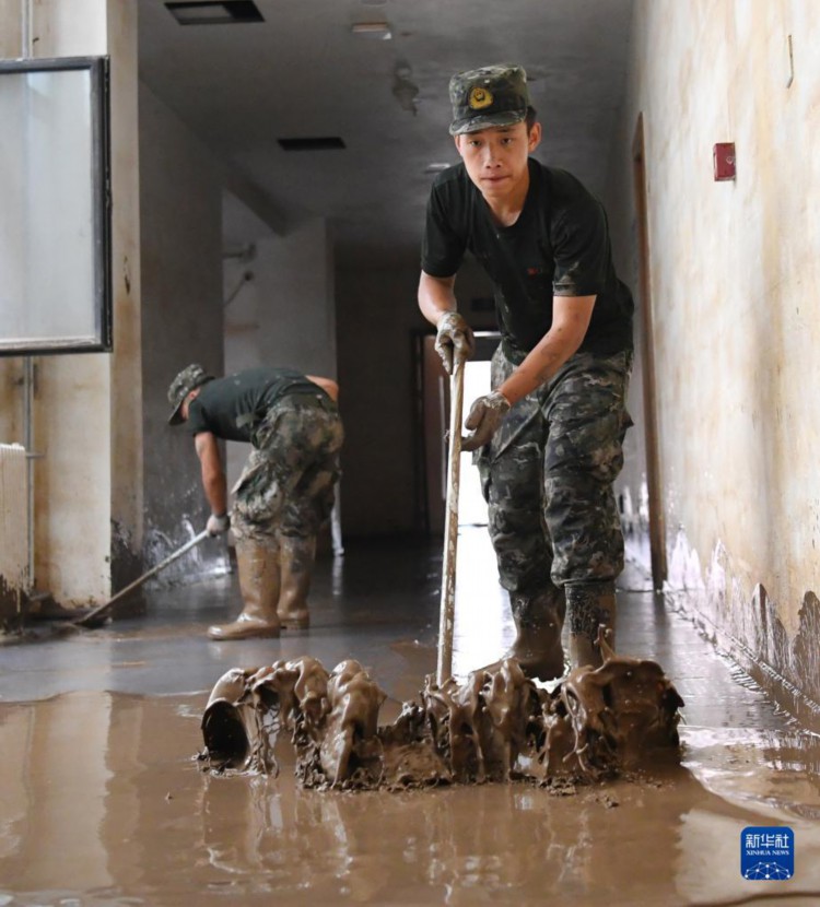 8月10日,武警河北总队保定支队战士在涿州中学教学楼清淤。 连日来,武警河北总队保定支队组织官兵在河北涿州中学开展清淤工作,为学校如期开学做好准备。 新华社记者 朱旭东 摄