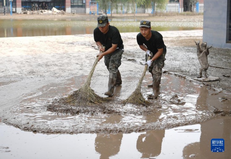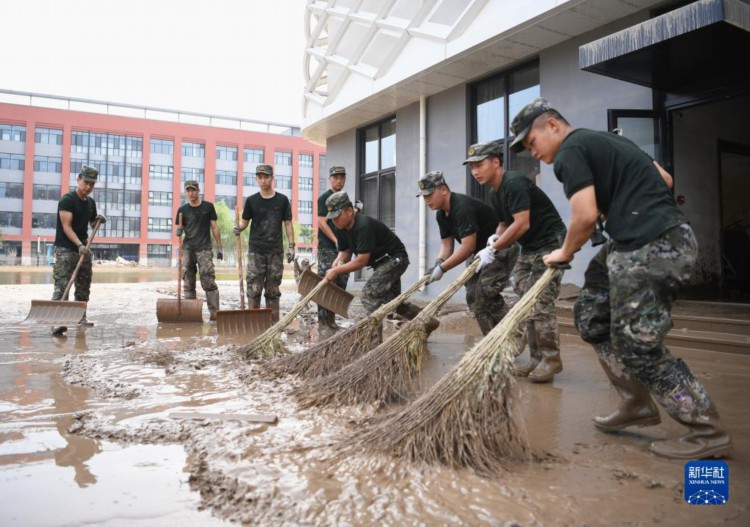 8月10日,武警河北总队保定支队战士在涿州中学清淤。 连日来,武警河北总队保定支队组织官兵在河北涿州中学开展清淤工作,为学校如期开学做好准备。 新华社记者 朱旭东 摄