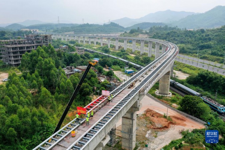 8月10日,广东清远磁浮旅游专线最后一榀轨排被吊装到横跨京广铁路的长隆特大桥上(无人机照片)。