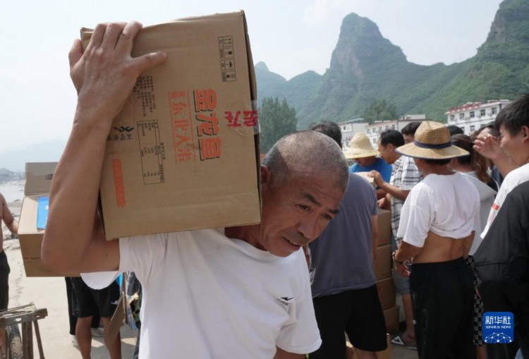 8月10日,在涞水县龙门乡,村民将捐赠的食品和饮用水卸车。 近日,河北省保定市涞水县出现强降雨,部分村庄交通、通讯等受阻。强降雨过后,当地在积极组织力量抢修重建的同时,及时将政府采购和社会各界捐赠的粮油、蔬菜、饮用水等物资送到群众家门口,以确保山区农村受灾群众基本生活需求。 新华社记者 杨世尧 摄