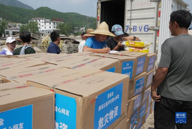 8月9日,涞水县三坡镇上庄村村民在领取大米。 近日,河北省保定市涞水县出现强降雨,部分村庄交通、通讯等受阻。强降雨过后,当地在积极组织力量抢修重建的同时,及时将政府采购和社会各界捐赠的粮油、蔬菜、饮用水等物资送到群众家门口,以确保山区农村受灾群众基本生活需求。 新华社记者 杨世尧 摄