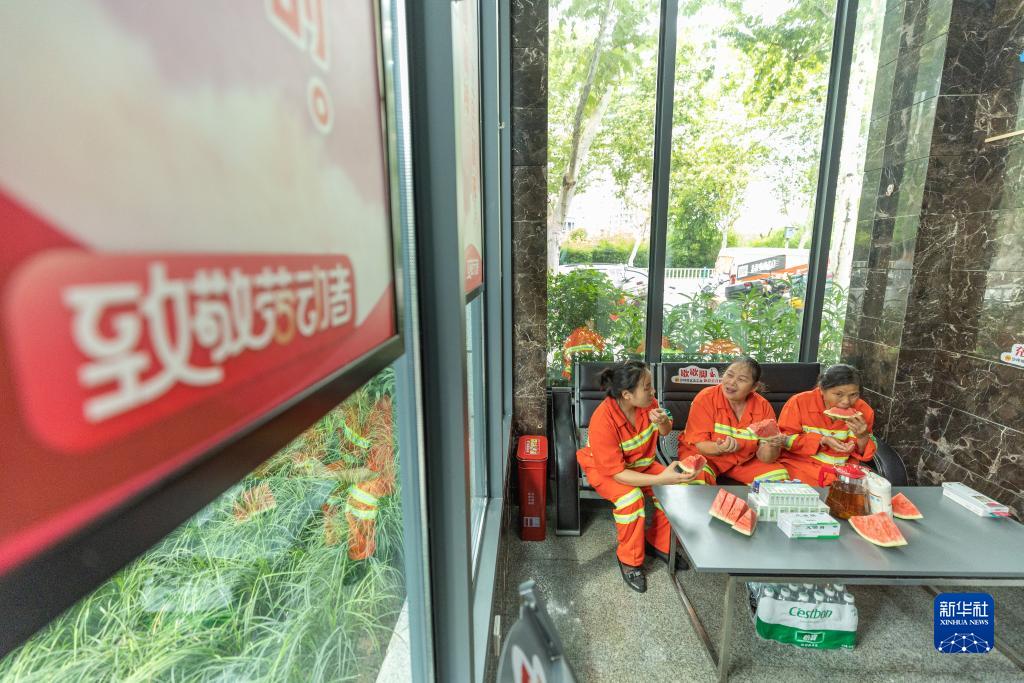 连日来,重庆市持续高温。重庆市沙坪坝区建立的“劳动者港湾”成为许多户外劳动者歇脚避暑的去处。
