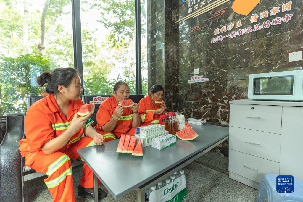 连日来,重庆市持续高温。重庆市沙坪坝区建立的“劳动者港湾”成为许多户外劳动者歇脚避暑的去处。