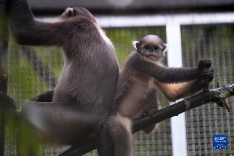 8月14日,两只黔金丝猴在梵净山野生动物救护中心嬉戏。