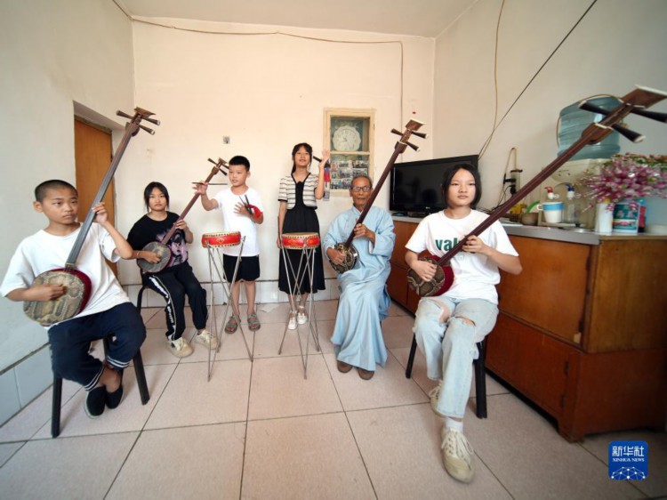 8月14日,在河北省沧州市沧县旧州镇后曹庄村,“沧州木板大鼓”国家级非遗传承人刘银河(右二)指导学生学习木板大鼓。