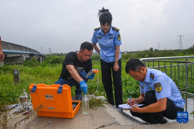 8月15日,湖州市生态环境局织里分局工作人员在织里镇振兴大桥水质监测点检测水质。 近年来,位于太湖南岸的浙江省湖州市吴兴区织里镇多措并举推进生态建设。今年以来,织里镇新建生态公园3座,新增造林面积226亩,铺设生态护岸3800米。 新华社记者 徐昱 摄