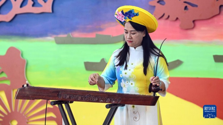 8月13日,在东兴京族博物馆,独弦琴传承人苏海珍为游客演奏。