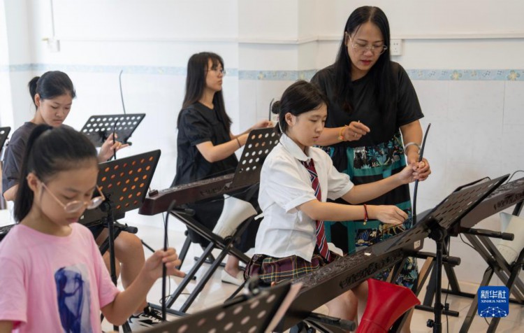 8月13日,东兴京族博物馆馆长、独弦琴传承人苏海珍(右一)在指导学生练习。