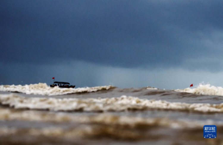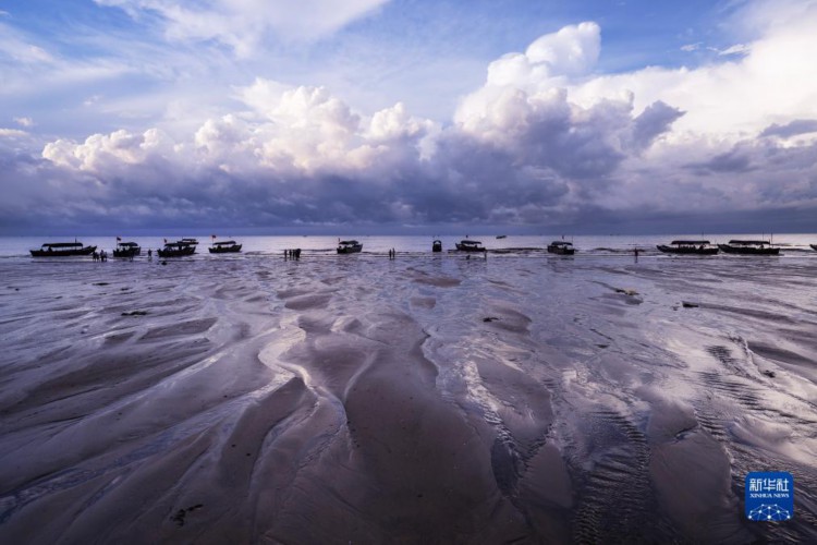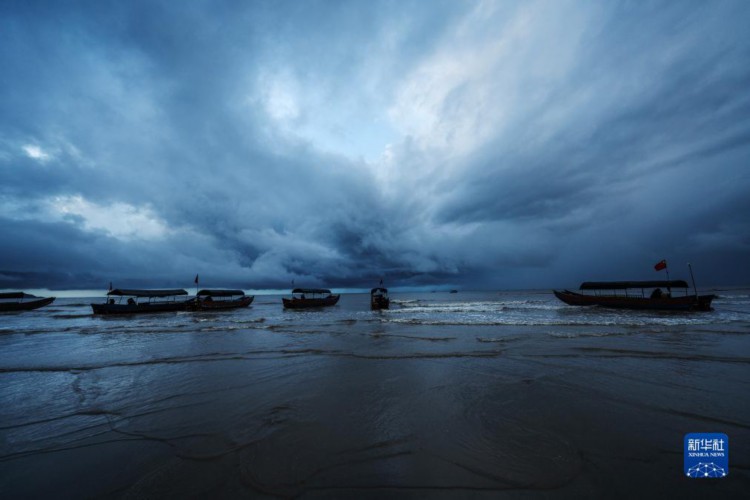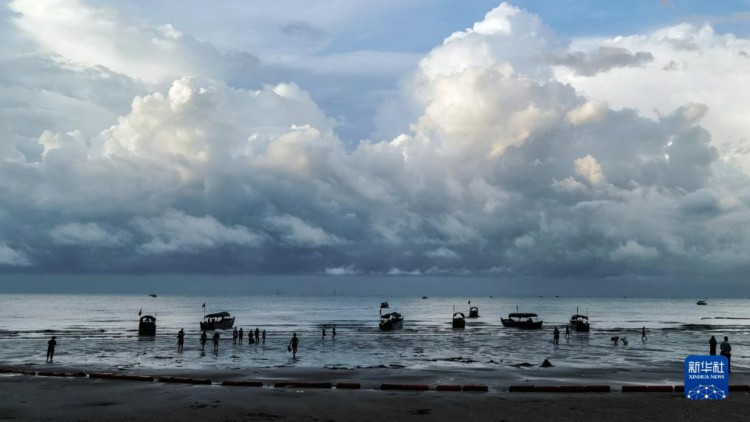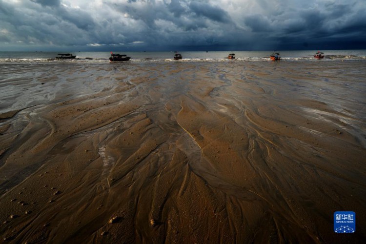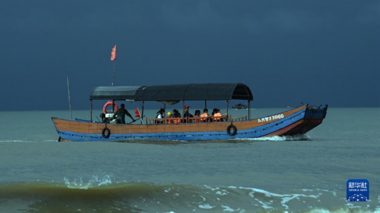 8月15日,游客抢在雷雨来临前乘船返程。 清晨,迅速变化的光线和云彩、来来往往的游客、闻鸡起舞的渔人以及奔腾不息的波浪,在广西东兴的金滩上一起奏响了一首美妙的乐曲。 金滩,位于东兴京族三岛中的(氵+万)尾岛南边,海岸线长15公里,因沙色金黄而得名。 新华社记者 张爱林 摄