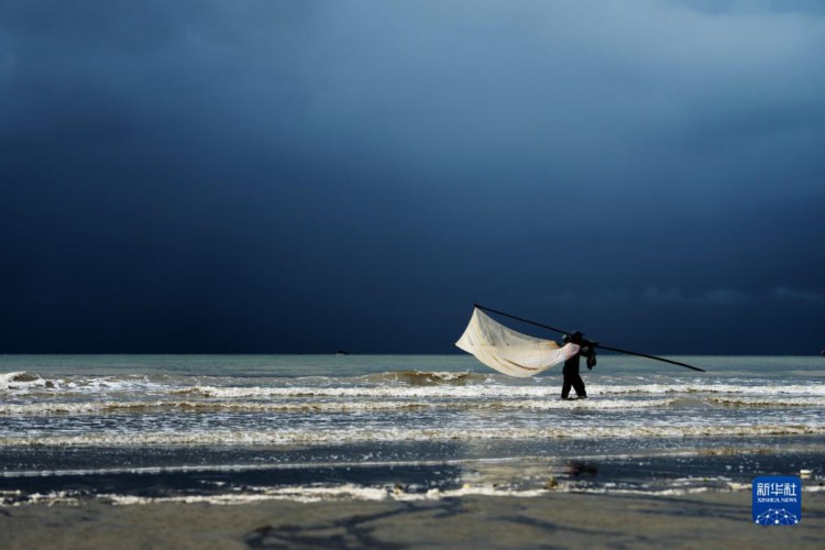 8月15日,渔民在海中捕鱼。 清晨,迅速变化的光线和云彩、来来往往的游客、闻鸡起舞的渔人以及奔腾不息的波浪,在广西东兴的金滩上一起奏响了一首美妙的乐曲。 金滩,位于东兴京族三岛中的(氵+万)尾岛南边,海岸线长15公里,因沙色金黄而得名。 新华社记者 费茂华 摄