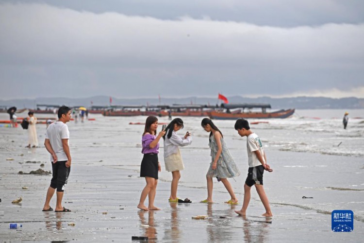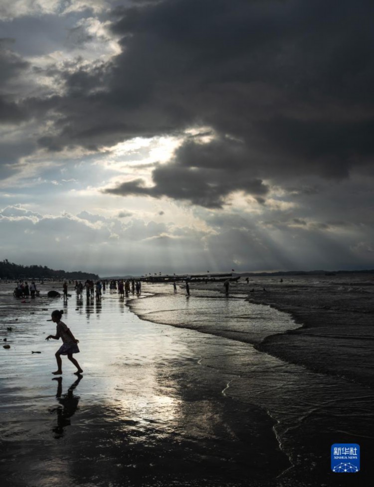8月15日,游客在海滩上玩耍。 清晨,迅速变化的光线和云彩、来来往往的游客、闻鸡起舞的渔人以及奔腾不息的波浪,在广西东兴的金滩上一起奏响了一首美妙的乐曲。 金滩,位于东兴京族三岛中的(氵+万)尾岛南边,海岸线长15公里,因沙色金黄而得名。 新华社记者 费茂华 摄