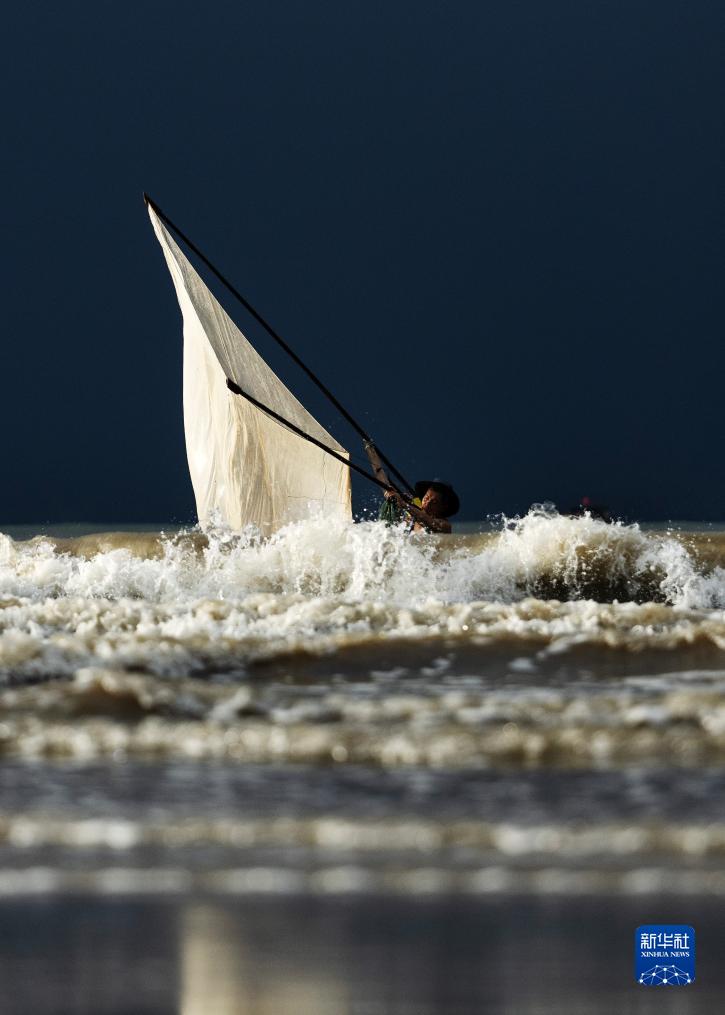 8月15日,渔船驶向远方。 清晨,迅速变化的光线和云彩、来来往往的游客、闻鸡起舞的渔人以及奔腾不息的波浪,在广西东兴的金滩上一起奏响了一首美妙的乐曲。 金滩,位于东兴京族三岛中的(氵+万)尾岛南边,海岸线长15公里,因沙色金黄而得名。 新华社记者 费茂华 摄