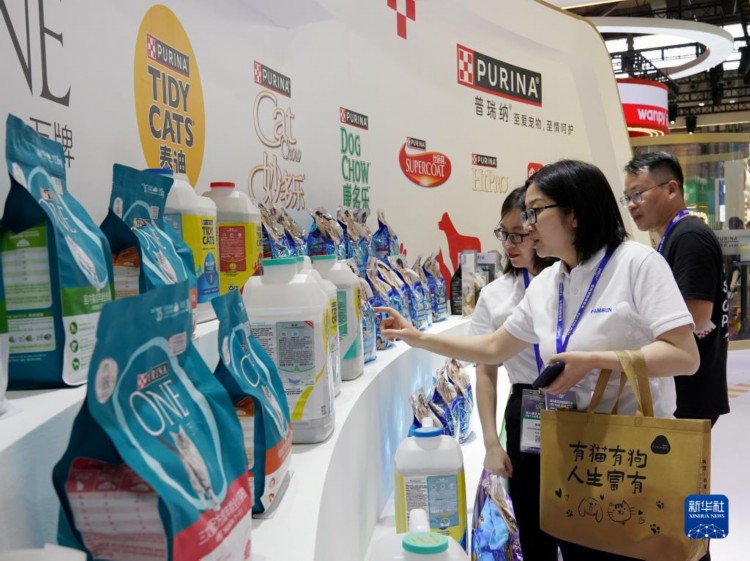 8月16日,观众在第25届亚洲宠物展览会宠物食品展台参观。