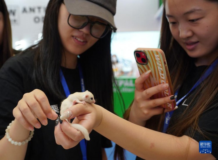 8月16日,观众在第25届亚洲宠物展览会上与蜜袋鼯互动。