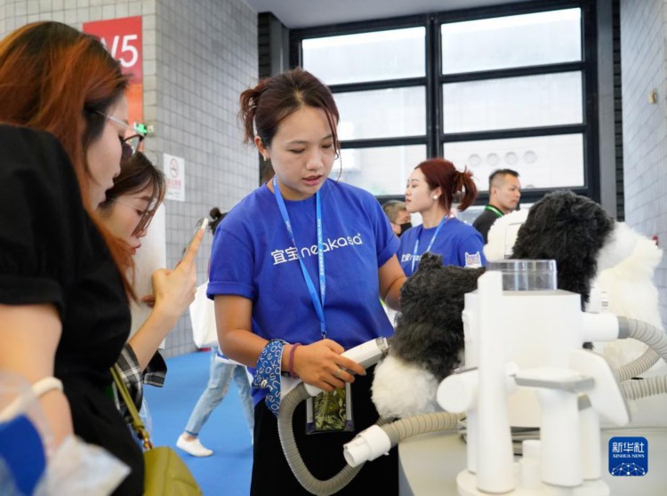 8月16日,在第25届亚洲宠物展览会上,参展商工作人员向观众演示宠物理毛器产品。
